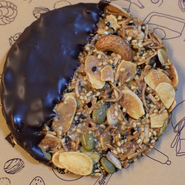 原材料名▶︎チョコレートコーチング、フロランタンミックス(ぶどう糖シロップ、砂糖、植物油脂、ぶどう糖、全粉乳)、カシューナッツ、スライスアーモンド、白ごま、ローストかぼちゃの種、黒ごま/乳化剤、香料、漂白剤(亜硫酸塩)、(一部に小麦・乳成分・アーモンド・カシューナッツ・ごま・大豆を含む)