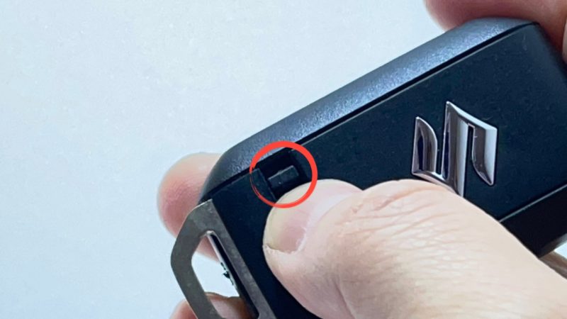スズキマーク側にある赤丸部分をスライドさせてスマートキーに刺さっているキー部分を抜きます。